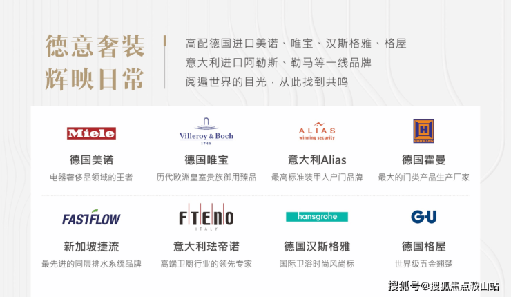 5、品质价值,全球顶级一线品牌精工品质,匠心打造人性化细节:德国Miele、hansgrohe、唯宝;意大利阿勒斯、珐帝诺、LEMA;比利时瑞纳斯;日本大金、百乐满;新加坡捷流等;