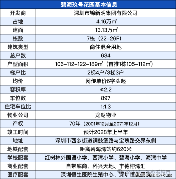 碧海玖号花园特邀操刀大疆天空之城、华润城的华阳国际设计集团担纲设计,于用材、立面、户型全方位精研,斩获缪斯设计金奖、美国 TITAN 房地产大奖金奖双项国际殊荣。项目总占地约 4.16 万㎡,总建面约 13.13 万㎡,容积率 2.2,规划 7 栋 22-26F 住宅(共约 634 套)、1 栋多层公寓及商业,配建幼儿园,集住宅、商业、单身公寓于一体,分两批开发,1-4 栋为一批,5-7 栋为二批。