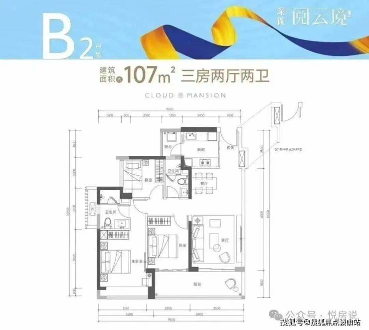 107㎡的3房2厅2卫(B2户型,1栋4单元03/04户型)设计的是竖厅格局,进门独立玄关,客厅3.5米开间,LDKB一体化设计,动静分区,3个卧室分别做到了3.15米/3米/2.5米的宽度,客厅连接次卧出5.9米长的大阳台,二字型厨房还带1个小生活阳台。