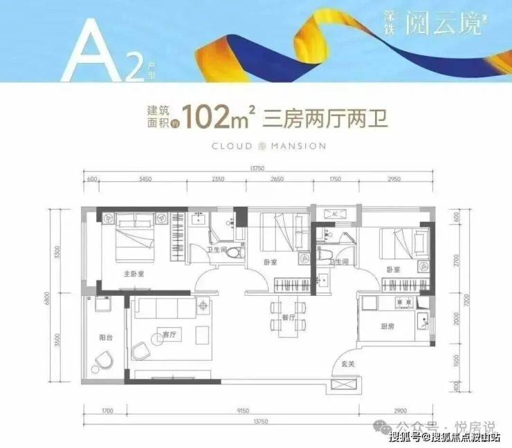 102㎡的3房2厅2卫,(A2户型,分布1栋4单元01/06户型)(设计的是经典横厅格局,进门独立玄关,客厅3.5米开间,LDKB一体化设计,3个卧室分别做到了主卧13.36㎡/次卧8.74㎡/次卧9.75㎡(包含墙体飘窗),L型厨房,公卫三段式分离,朝东向或者西向。