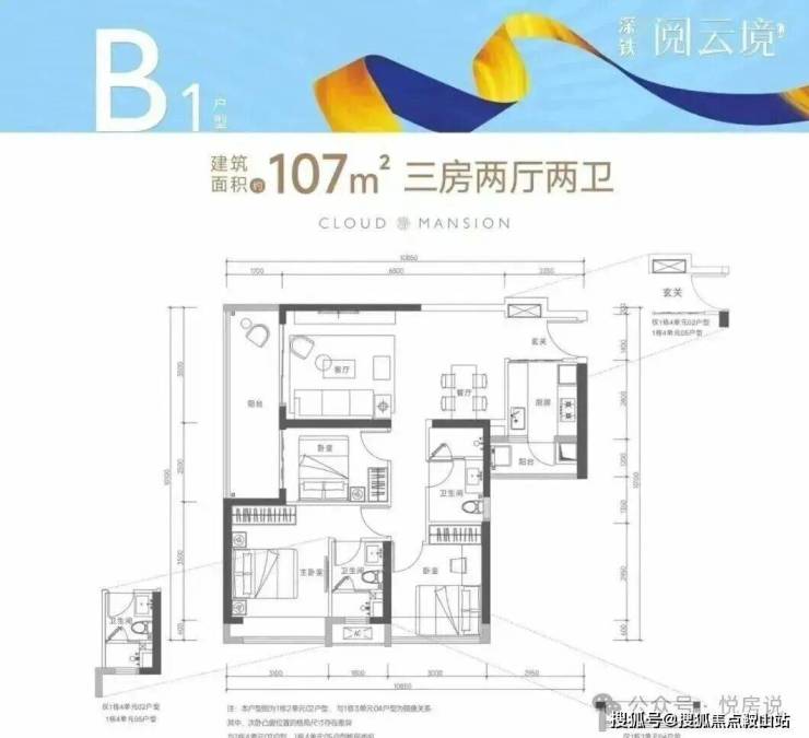 107㎡的3房2厅2卫,(B1户型,分布1栋4单元02/05户型),设计的是竖厅格局,进门独立玄关,客厅3.5米开间,LDKB一体化设计,动静分区,3个卧室分别做到了3.1米/3米/2.5米的宽度,客厅连接次卧出6米长的大阳台,二字型厨房还带1个小生活阳台。