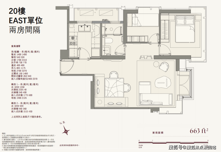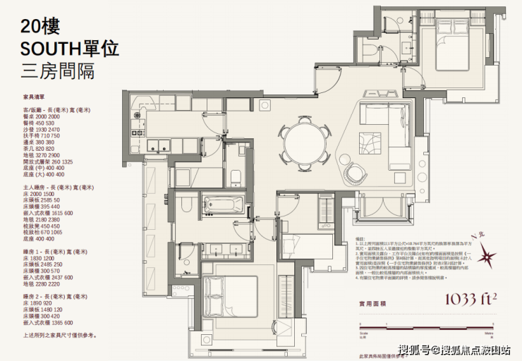 示范单位-20楼South室,面积1,033方呎,3房1套连佣人房间隔