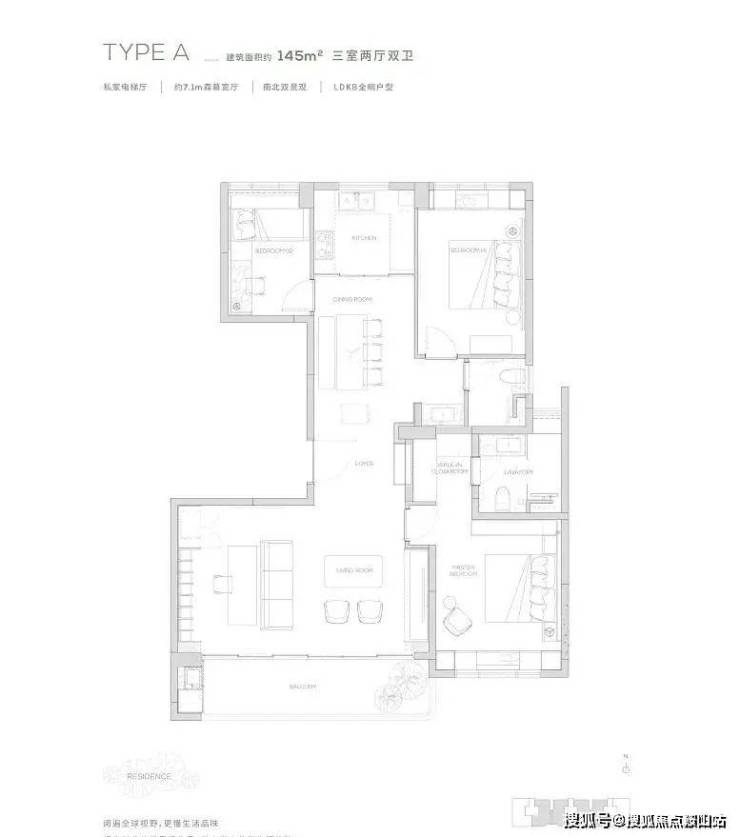 145产品为三房两厅两卫产品,餐厨一体化设计, 7米宽厅可切换各种生活场景,畅享宽幕般景观界面。