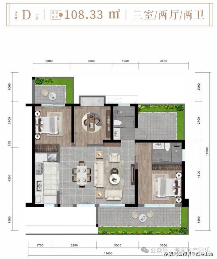D户型约108㎡全景三房房两厅两卫
