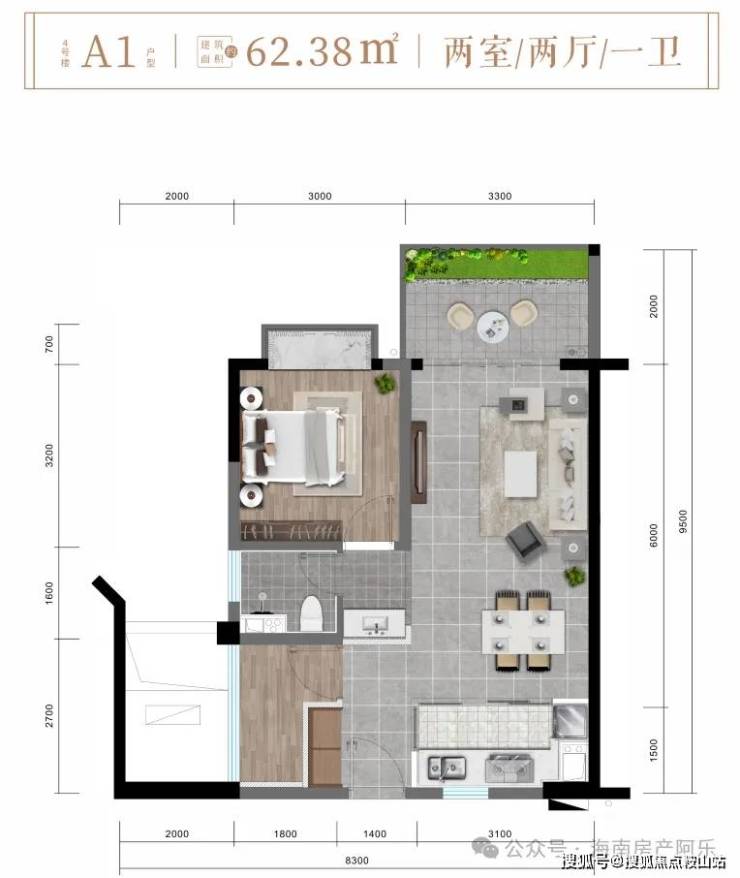 A1户型约62㎡精致两房两厅一卫