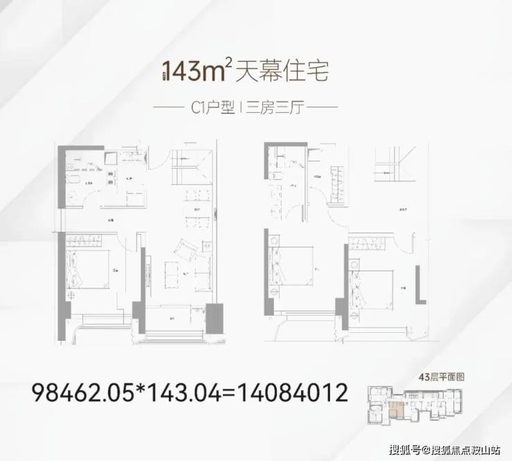 C户型,143.04平米,备案单价:98462.05元/平米,总价14084012元(原始三房可改5房,加建费另算,现场谈)