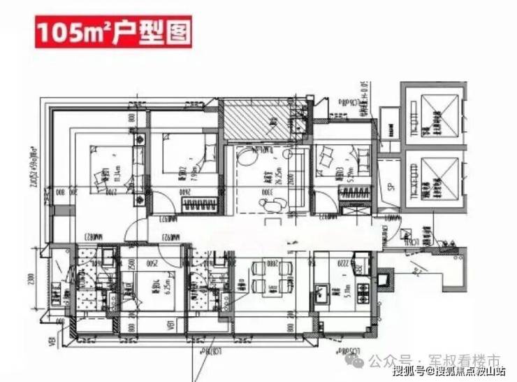 建面约105平方米户型:采用横厅布局,客餐厅连接宽景阳台,餐厅空间可灵活打开,形成开阔公区;整体格局方正,主卧套房设计保障私密性。
