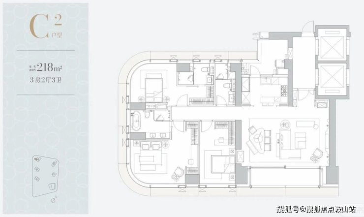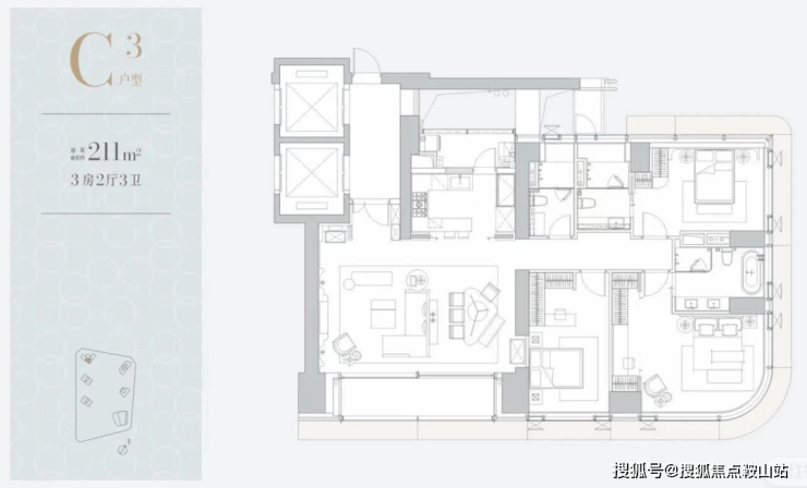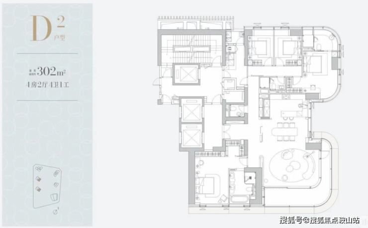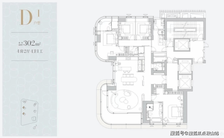一层两户,经典大平层:约305㎡主力户型,空间布局方正大气,功能完备。