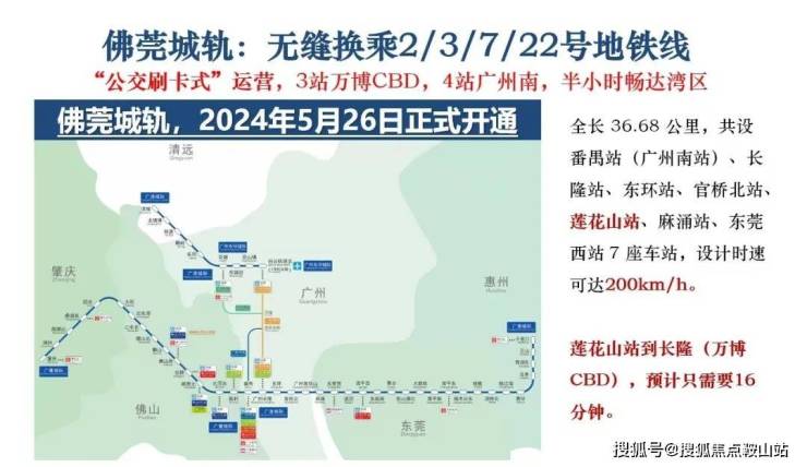 地铁交通:距离项目2.5公里处有莲花山站,佛莞肇城际已经开通运营了,3 站到长隆万博,4 站到广州南站。另外佛莞深城轨琶洲支线还在建设中,(2 站到大学城,3 站到琶洲)以及广中珠澳城轨(规划中)和8号线地铁的东延段(预计2027年通车)。