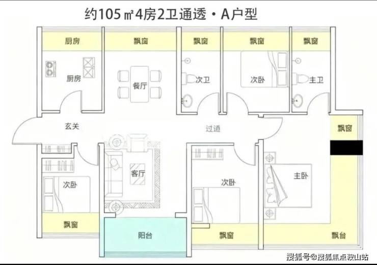 约105-122㎡四房:作为“功能型品质起步”户型,凭借新规下的高实用率(包含赠送得房率约100%)选。主卧均带270°环绕式飘窗,户型设计通过飘窗“送了不少面积