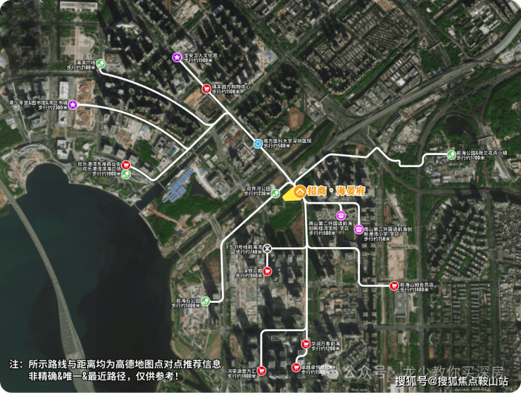 这里最近地铁为1/5/11号线前海湾站,直线距离约一公里,地图显示所需步行时间约16分钟左右,此外,项目临近梦海大道与怡海大道,自驾车辆前往深圳各区相对便捷。