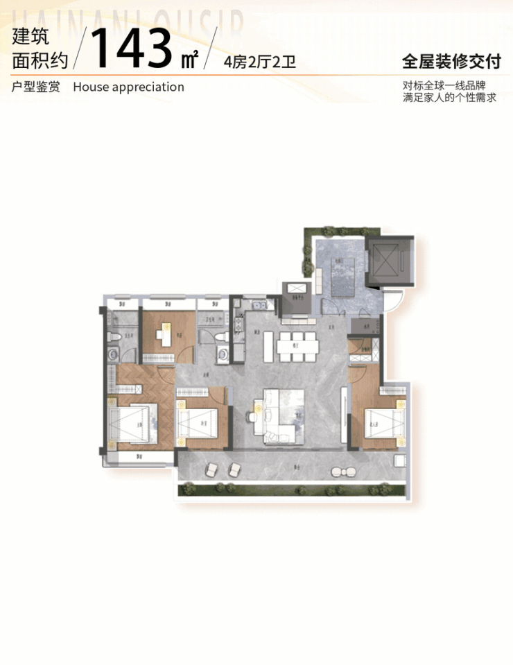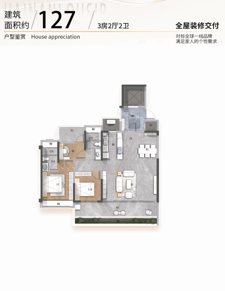 全屋交付均为一线大牌,搭配星级主卧套房设计,海岛定制化的精致生活为你而来。