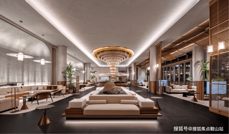 穿过大堂是下沉式水吧区,7米高雨林瀑布叠水顺石流淌,耳畔溪流声伴满眼绿植,五观五感皆是松弛享受。
