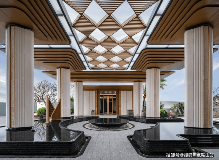椰林仿生门廊搭配天然石材前台,阳光与庭院乔木交织,宛如星级酒店。