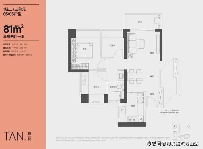 81㎡的3房2厅1卫,设计的是竖厅格局,LKDB一体化设计,进门入户玄关,有1个次卧做的双飘窗,U型厨房,卫生间三段式分离,得房率:74.34%(不含赠送),全部西北朝向。