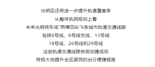 交通动脉贯通,深度融入城市核心圈。地铁6号线的运营,彻底打破了光明与市中心的时空隔阂。13号线(在建)的持续推进,未来将实现与深圳湾、南山科技园的快速直连。交通路网的飞速发展,让光明不再是遥远的“关外”,而成为深圳核心功能区的重要延伸,吸引了大量南山、宝安外溢的刚需和改善型购房者。