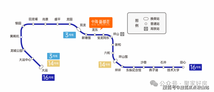 地铁配套:中海新都荟,家门口就是16号地铁线“龙东站”,该线路是起自坪山田心,开往龙岗大运枢纽的普线,2站可到坪山高铁站,11站到大运站可换乘3/14号线。