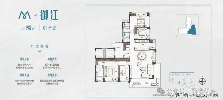 约8.1m宽幕主阳台,内可望园景 外可望江景+城景南向四开间约15.8m+主卧约4.4M观景阳台