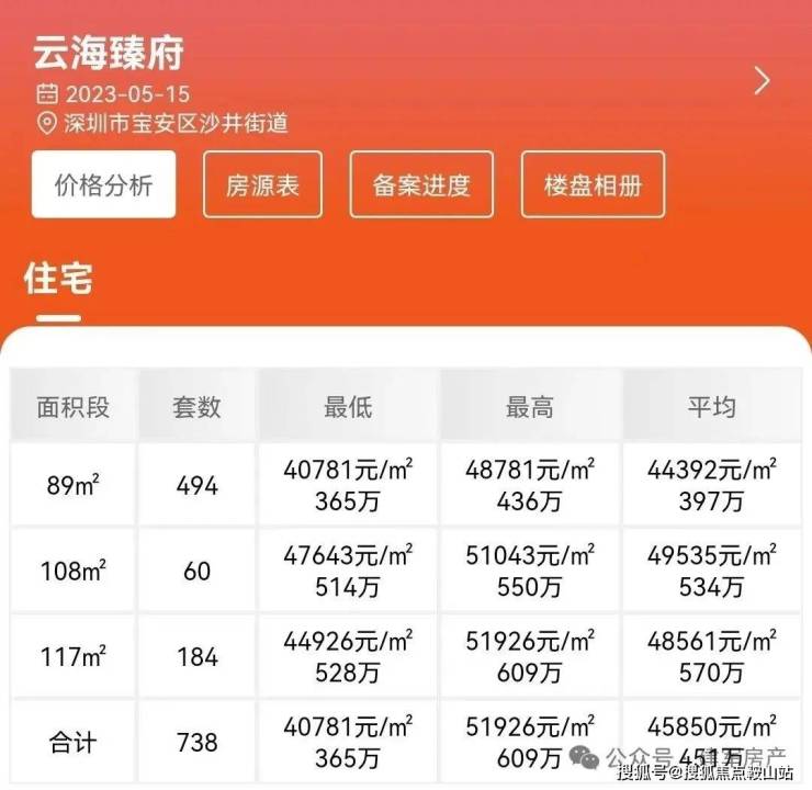 宝安-沙井,特发云海瑧府于2023年5月16日取证入市,本次推出1/2/3/4栋共计738套住宅房源,面积89㎡的3房2卫,108㎡的4房2卫,117㎡的4房2卫户型,备案单价4.07万-5.19万/㎡,备案均价4.58万/㎡,总价365-609万/套,2025年6月份送简装交房。