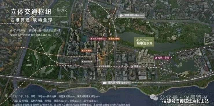 GCC联泰超总湾项目为地铁上盖物业,近距接驳2号线红树湾站与9号线深湾站。而深超总片区规划"六轨六站"立体交通网络,包括地铁2、9、11号线,规划中的29号线以及穗莞深、深莞城际轨道。