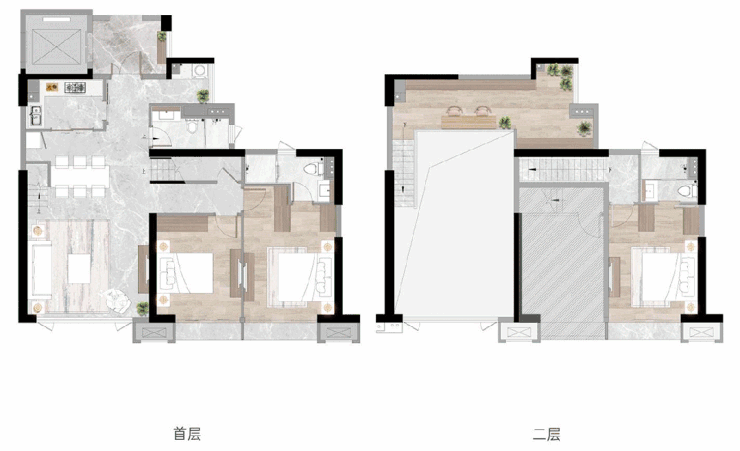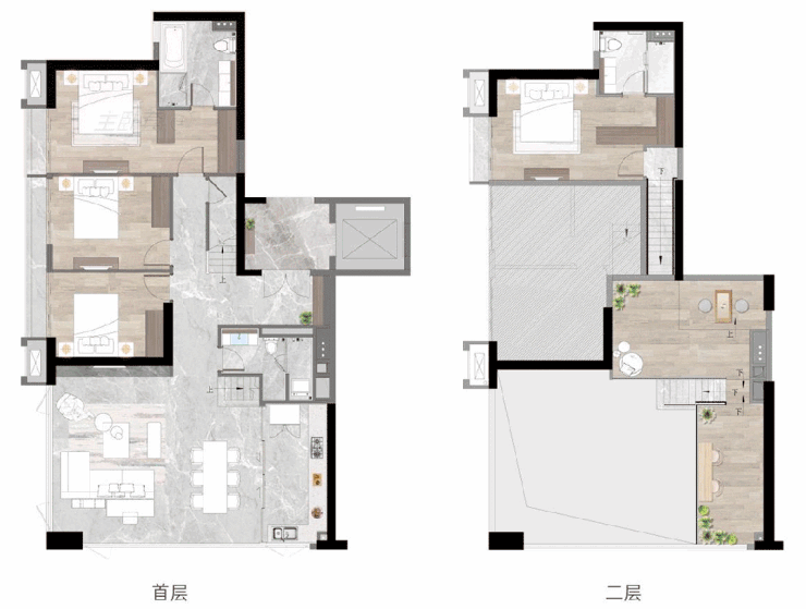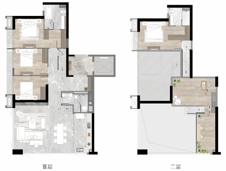 大人在首层高谈阔论,孩子们也能拥有一片属于自己的天地,即使“疯玩”也不怕吵闹互相影响,得房率也得到了超大的提升,百变又实用。