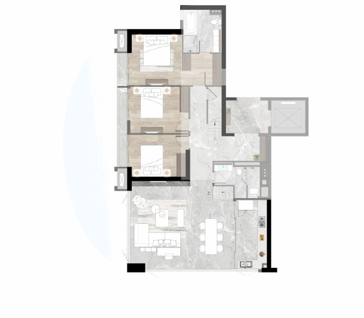 这样的空间尺度感远远超过同面积段的大平层,甚至可以比肩300平以上的户型。