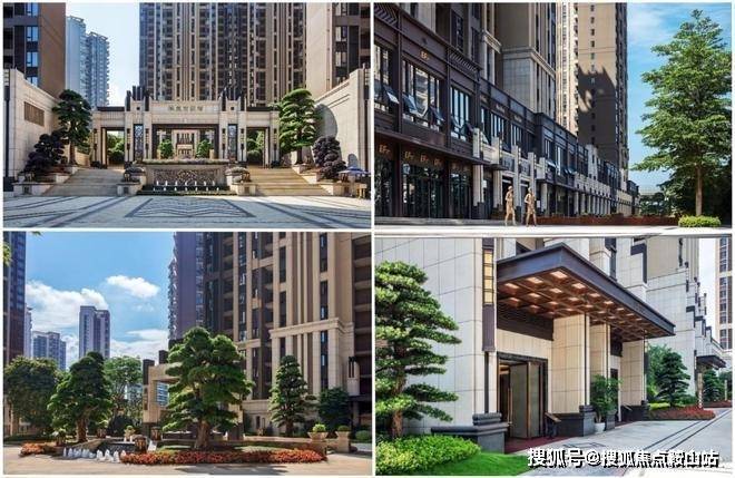 建筑风格:Art Deco 立面,深褐色与淡黄色石材搭配,主入口采用干挂石材及百年罗汉松,彰显品质。