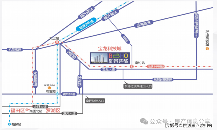 项目直连地铁14号线南约地铁口,2站大运、9站福田,未来可享三地铁交汇利好;沈海高速和东部过境高速南北贯穿,直通罗湖,无缝连接福田、南山;坐享地铁、铁路交通、公交枢纽等多维交通体系,快速通达深圳中心城区、香港及周边城市,高效链接都会生活圈。