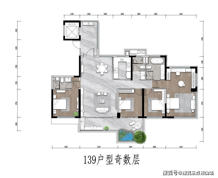 139㎡户型实现所有房间朝南的南向五开间格局;双套房设计,主卧套实现南北通带独立衣帽间,主卫五件套布局。