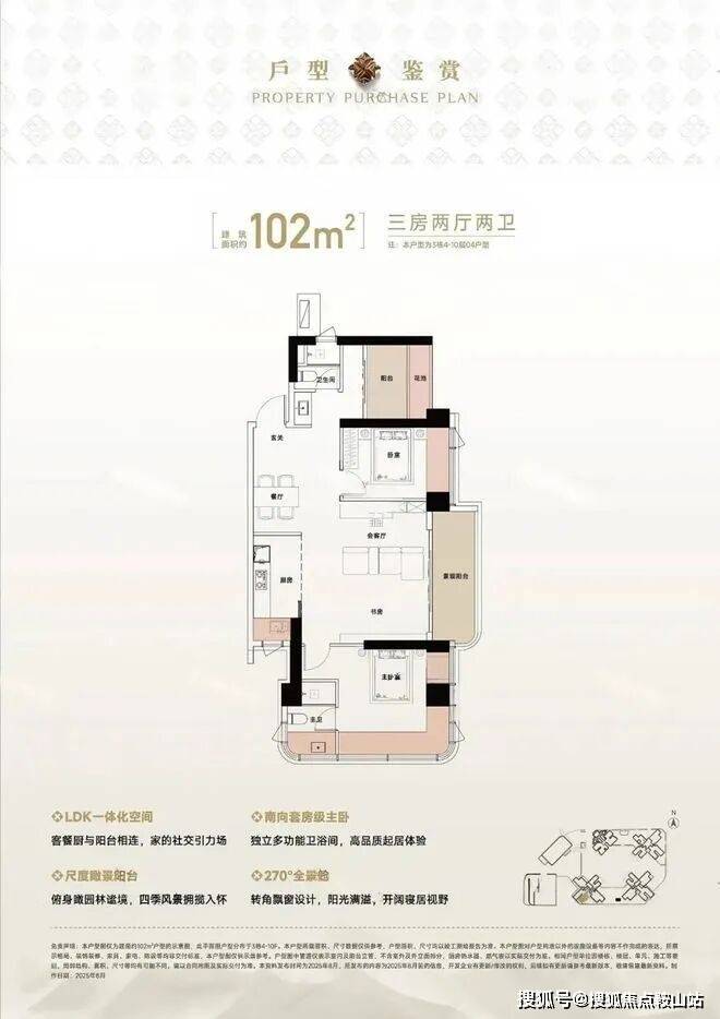102㎡的3房2厅2卫,设计的是竖厅格局,LDK一体化设计,四开间朝南,主卧270°全景舱,L型厨房,公卫三段式干湿分离,得房率约94%(包含赠送),东南朝向看海景视野。