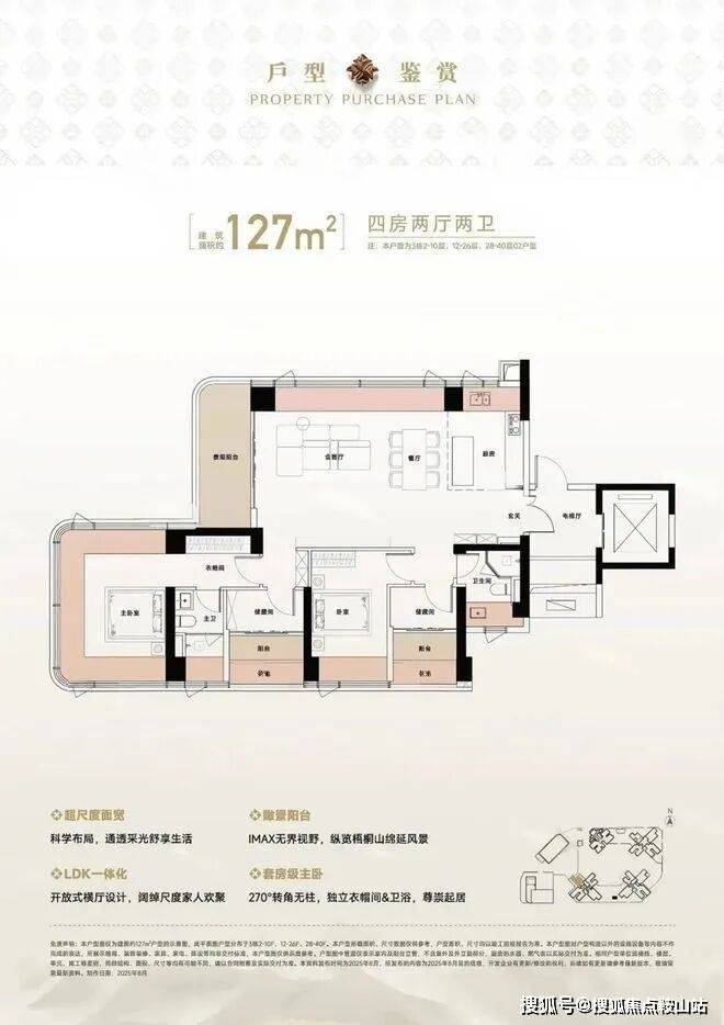 127㎡的4房2厅2卫,设计的是竖厅格局,尊享独立电梯入户,LDKB一体化设计,动静分区,六开间朝南,主卧270°无柱转角全景舱,L型厨房+岛台设计,卫生间干湿分离,得房率约105%(包含赠送),西北朝向看一线梧桐山景观。