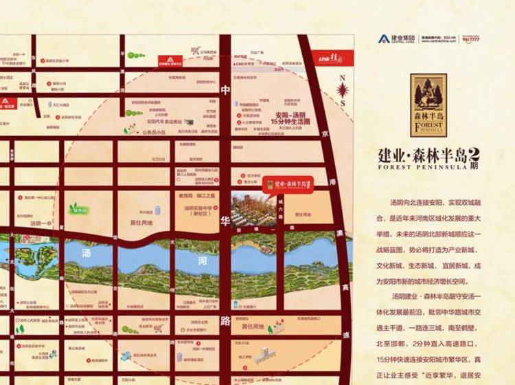建业·森林半岛,处于安汤一体核心腹地,主干道中华路南段,汤河公园对面,2分钟到高速出入口,15分钟快速连接安阳城市繁华区,地理位置优越,交通便利,是属于城市稀缺的黄金地段,未来的城市CBD。不仅可以便捷地享受安阳产业专业带来的城市资源,同时,也方便维护两城间的人脉资源,在自然的宁静与城市的动感之间转换自如。