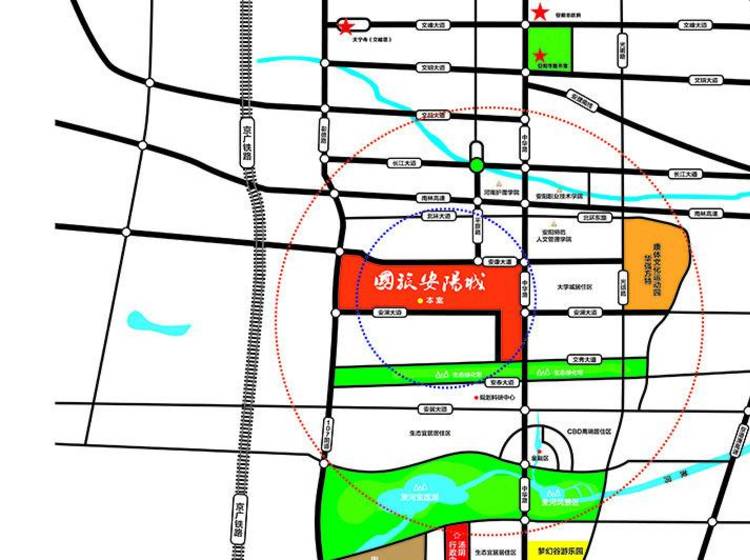 商场或超市:正大国际 学校:大学 河南护理学院 安阳职业技术学院 安阳师范人文管理学院 餐饮娱乐:中影、国美 住宅:碧桂园 休闲健身:天之瑶 梦幻谷 周易文化产业园 安阳康体文化运动园 华强方特乐园 其他:易商谷 正大国际商贸城 入住企业:盛德利、遇见CAKE、阿上阿上