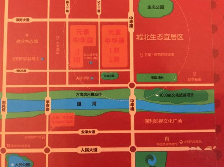 元泰·中华园由河南元泰住建集团开发建设,位于安阳市洹北新城区——中华桥北路西,占据安阳城市中轴线——中华路,与行政及商业中心直线相连。洹北新城是安阳向北拓展、联动“豫北区域中心城市”发展的重要节点,中华路是安阳城市发展的主动脉,中华园恰处于洹北新城与中心城区连接的咽喉地带,地理位置非常优越。 元泰·中华园正在建设的为项目1期,总占地面积约52.05亩,总建筑面积约145917.96万㎡。项目采用新中式建筑风格,设计理念采用古朴柔和的中性色彩,给人以清雅含蓄的感受;以简单凝练的中式建筑元素,体现出项目的端庄华丽的气韵。项目绿化率高达40.1%,通过巧妙的中式皇家园林景观设计,使园内住宅与景观融为一体,增加了景观空间的通透性。沿HB23号路,HB20号路设置了独立的一层商业配套设施,局部为二层,与园区中心位置的生态公园相互辉映,形成了一步一景的中式风情商业街。 未来的中华园2期项目,将在中心位置建设“主题生态公园”,与项目南侧“万亩洹河风光带”相得益彰,景观环境优势十分明显,建成后将成为安阳 “城北生态宜居区”的重要地标,成为安阳北区一道靓丽的风景线。 中华园配建了高品质双语幼儿园,人民大道小学分校将在中华园2项目南部建成;实验高中(六中)中华园不足800米;位于项目南侧的实验初中,距中华园仅200米;周边名校汇聚,业主可轻松享受0-18岁全程金牌教育。