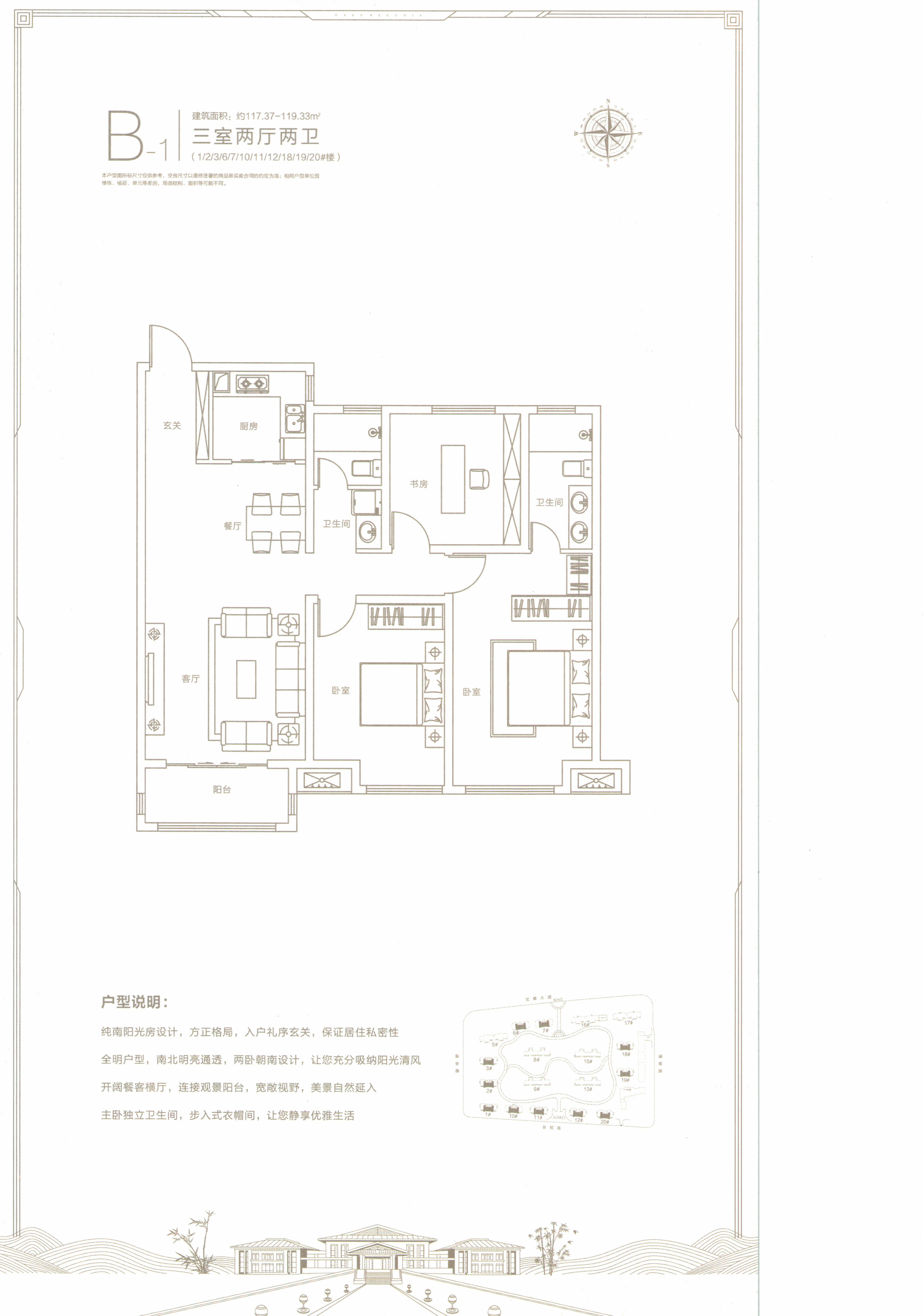 下叠院(三室三卫),面积:197㎡,主卧带衣帽间、卫生间、北向阳台,开间5.1米的挑空客厅,送5.6米超高挑空地下室58平米、46平米下沉小院、南北双花园100平米,户数56个。