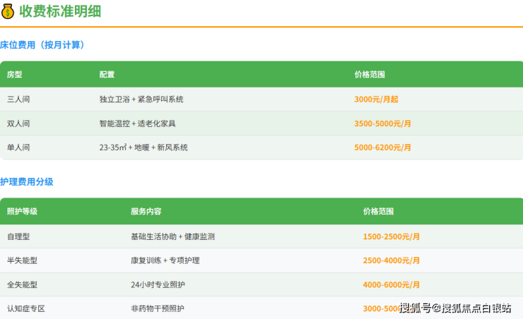 自理型长者:1500-2500元/月,包含健康监测、基础康复训练等服务。