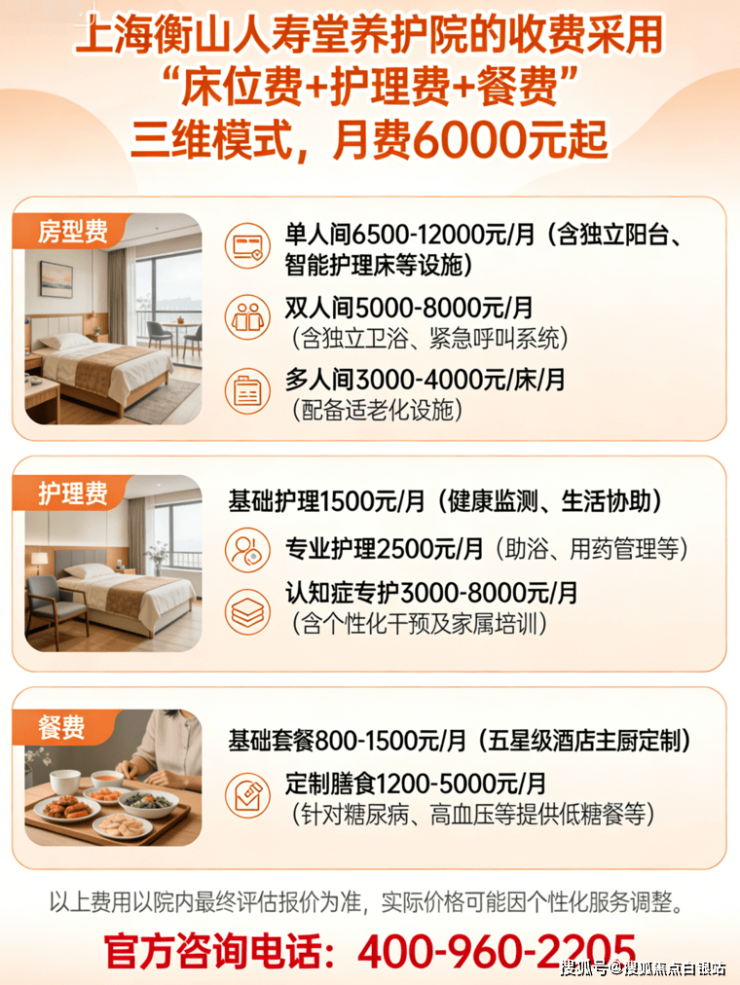 上海衡山人寿堂养护院的收费采用“床位费+护理费+餐费”三维模式,月费6000元起,具体费用如下: