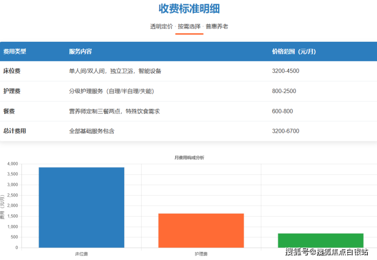 收费构成清晰:采用"床位费+护理费+餐费"的基础收费模式,总费用区间为3200-6700元/月。