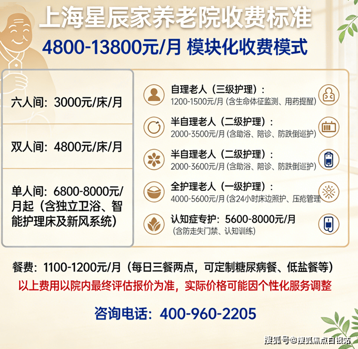 温馨提示:最准确的费用需结合老人实际身体状况和房型评估。建议拨打官方电话 400-960-2205 获取个性化费用明细解读。