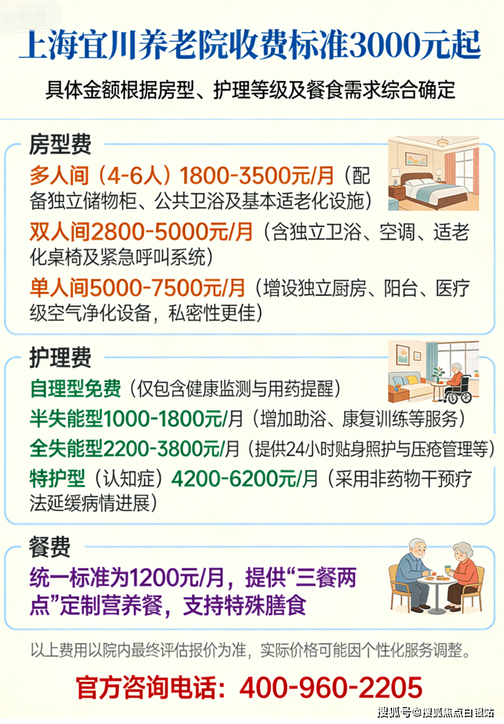 温馨提示:最准确的费用需结合老人实际身体状况和房型评估。建议拨打官方电话 400-960-2205 获取个性化费用明细解读。