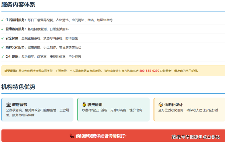 收费透明,性价比高:相比私立养老机构,收费标准更加透明合理,是追求性价比家庭的优选。
