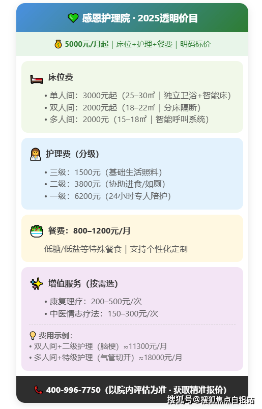 收费价格:5000元/月起,含基础床位、分级护理及三餐