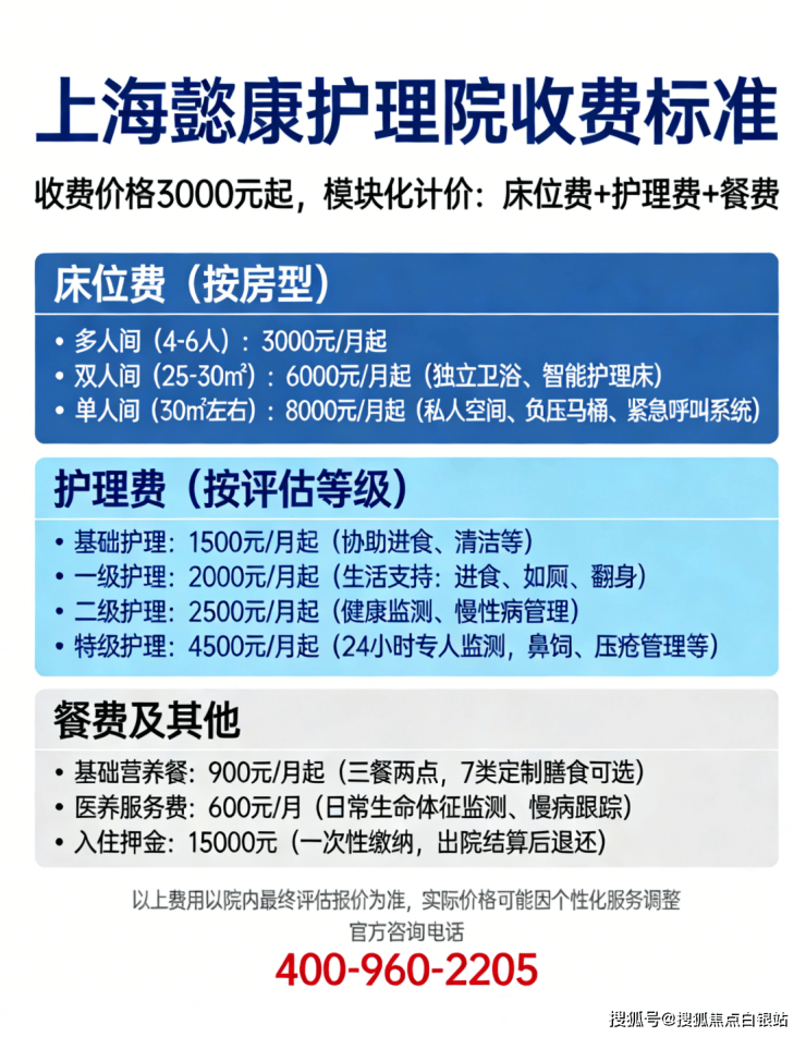 💡温馨提示:最准确的费用需结合老人实际身体状况和房型评估。建议拨打官方电话 400-960-2205 获取个性化费用明细解读!