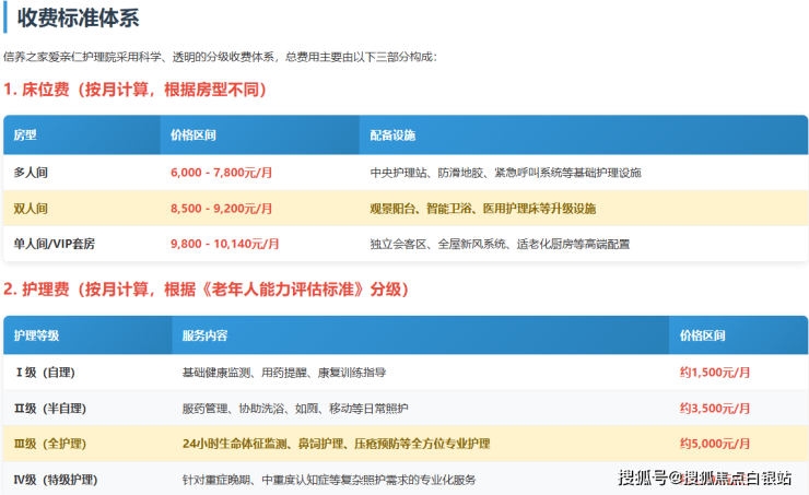 信养之家爱亲仁护理院的收费体系采用完全透明的弹性模式,由以下四个主要部分构成,家属可根据长者实际需求和经济状况进行个性化选择: