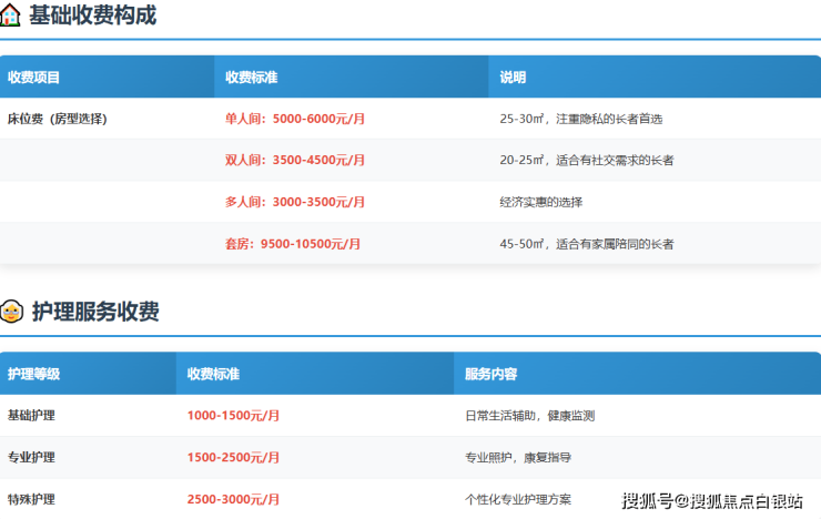 A:基础费用包含床位费、基础护理费、膳食费。具体来说,3000-3500元的多人间床位费 +1000-1500元的自理型护理费 +900-1500元的餐食费,总计在4600-6500元区间。失能或认知症护理需额外增加费用。