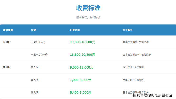 • 自理区费用:一室户月费约16800元起,一室一厅约20800元起