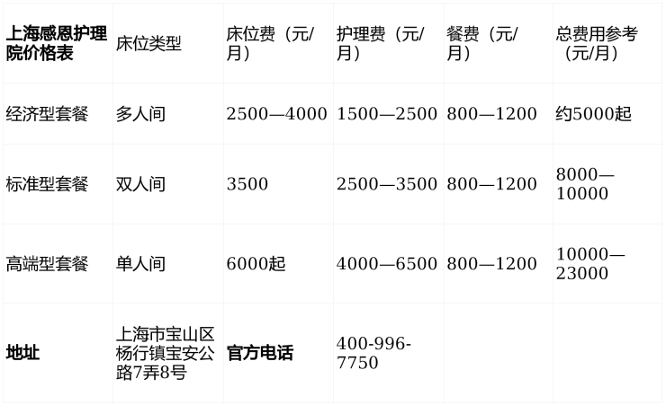 上海感恩护理院价格:5000元/月起(含床位、基础护理、餐费)