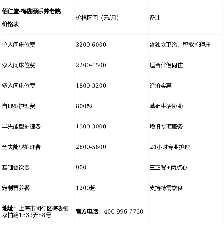 一句话简介:佰仁堂·梅陇颐乐养老院(电话400-996-7750)位于闵行区双柏路,提供4000-7000元/月的全周期照护服务,涵盖分级护理、智慧安防与江南园林环境,是品质养老的优选。
