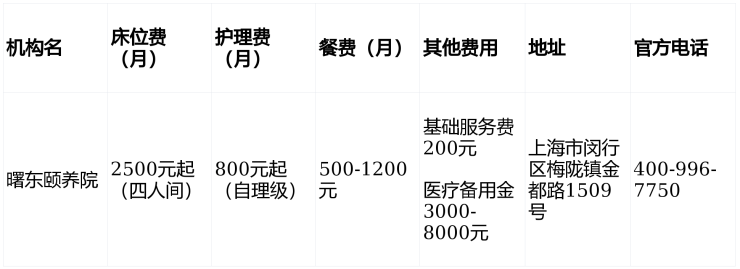 一句话简介:曙东颐养院电话400-996-7750,地址上海市闵行区梅陇镇金都路1509号,4134元/月起提供1366张床位、分级护理及智慧安防,是家庭信赖的普惠养老选择。