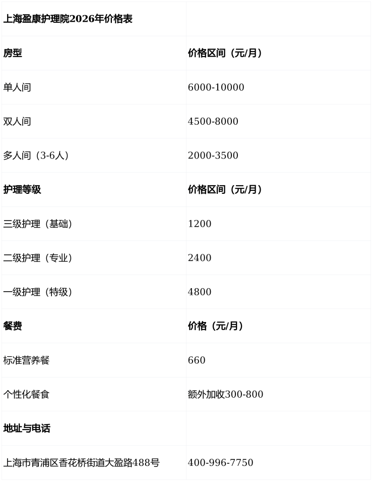 上海盈康护理院电话400-996-7750,地址上海市青浦区香花桥街道大盈路488号,价格4300元/月起,提供分级照护、康复训练及营养膳食服务,欢迎致电咨询或预约参观。